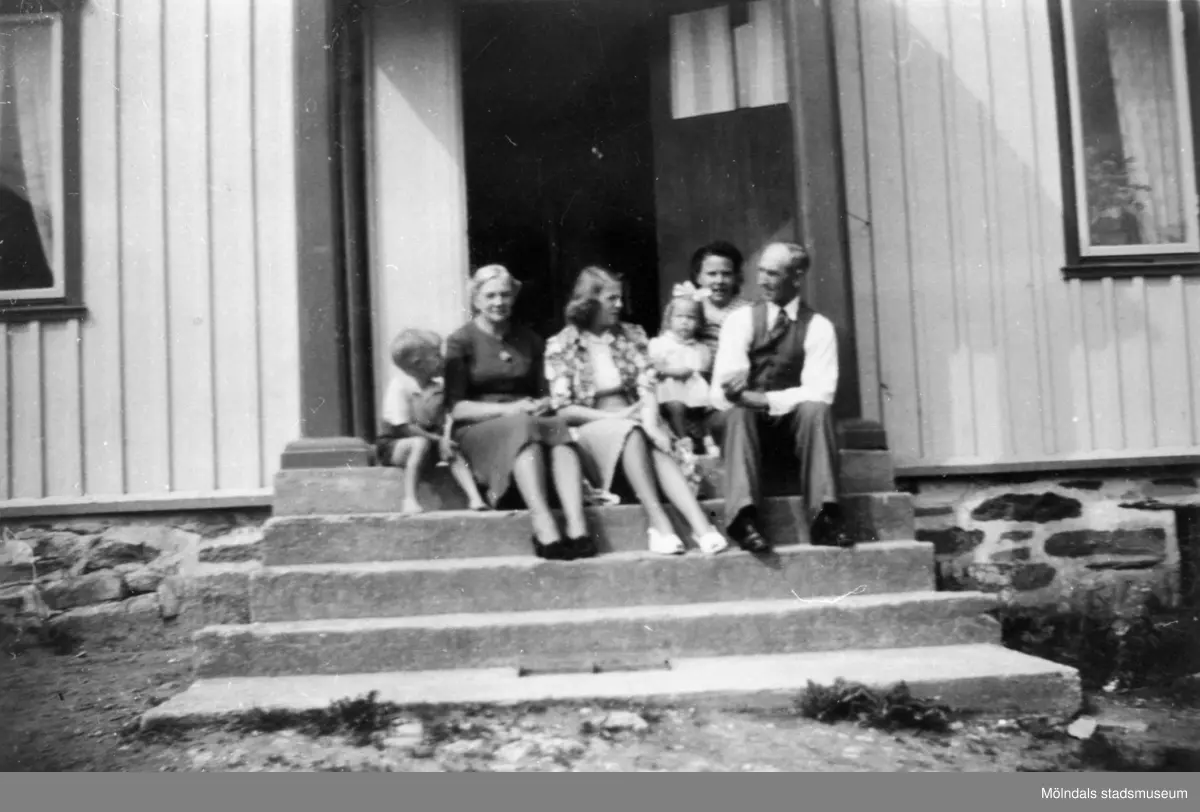 August Werners ägde "Bergmans" affär som låg i Anderstorp. Personerna som sitter på trappan till affären är Kurt, fru Eriksson, Ingrid (dotter till Erikssons), Hjördis i mamma Elsas knä, herr Eriksson "verkmästaren". Lindome 1949.