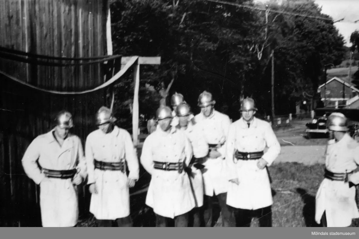 Lindome Borgarbrandkår 1945: Sten Karlsson, Karl Karlsson, Sven Lennart, Elis Andersson, Karl-Erik och Birger. Samtliga brandmän var anställda hos August Werners textilfabrik (Anderstorps fabrik).