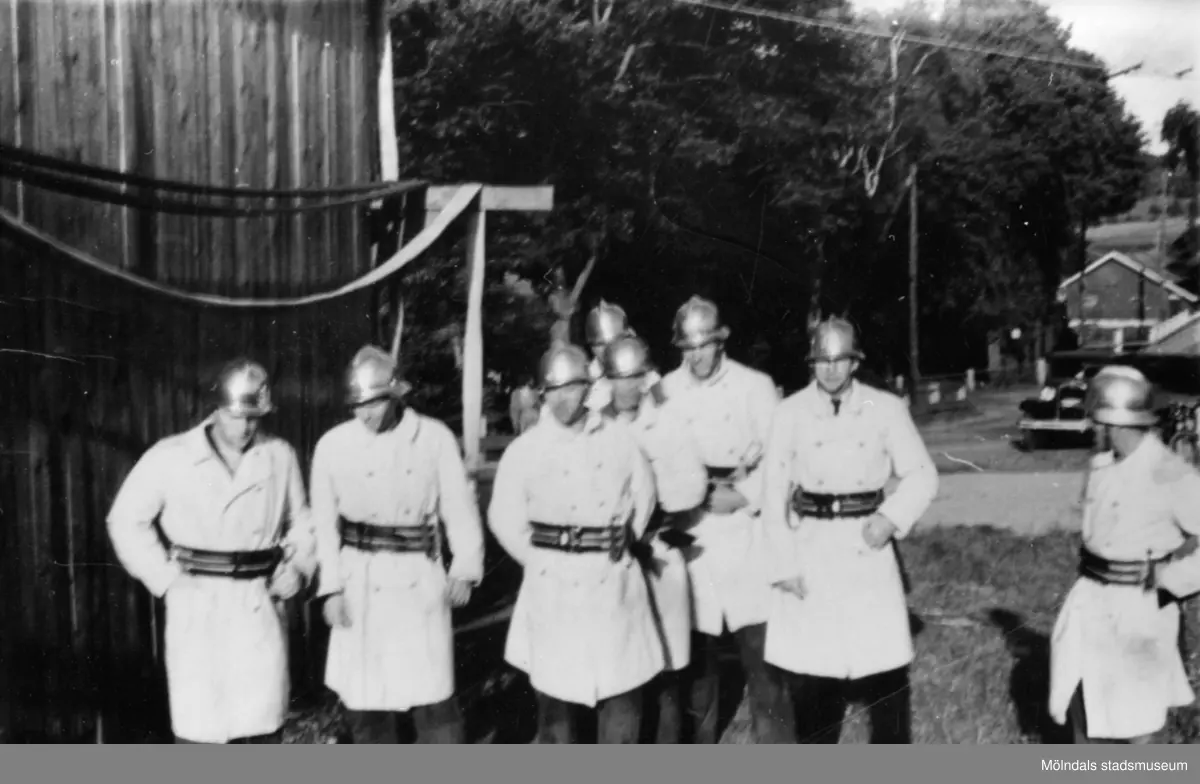 Lindome Borgarbrandkår 1945: Sten Karlsson, Karl Karlsson, Sven Lennart, Karl-Erik, Birger och Elis Andersson. Samtliga brandmän var anställda hos August Werners textilfabrik (Anderstorps fabrik).