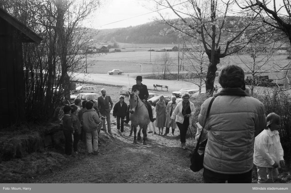 Almåsgården och Lindome hembygdsgille anordnar sommarkafé på Börjesgården i Hällesåker, år 1984. Philip Oscander och hans granna fjording anländer med budkavlen efter en tvåmilaritt från Vallda.