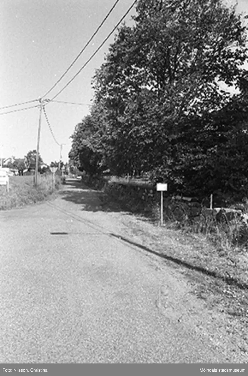 Södra änden av Spinnmästarevägen i Lindome, hösten 1994. Till höger innanför stenmuren ligger Werners fabriker. Den lilla skylten är "VÄGMINNE Spinnmästarevägen" som ingår i en av de kulturhistoriskt värdefulla vägmiljöerna i Vägverkets Vägminnesprogram.