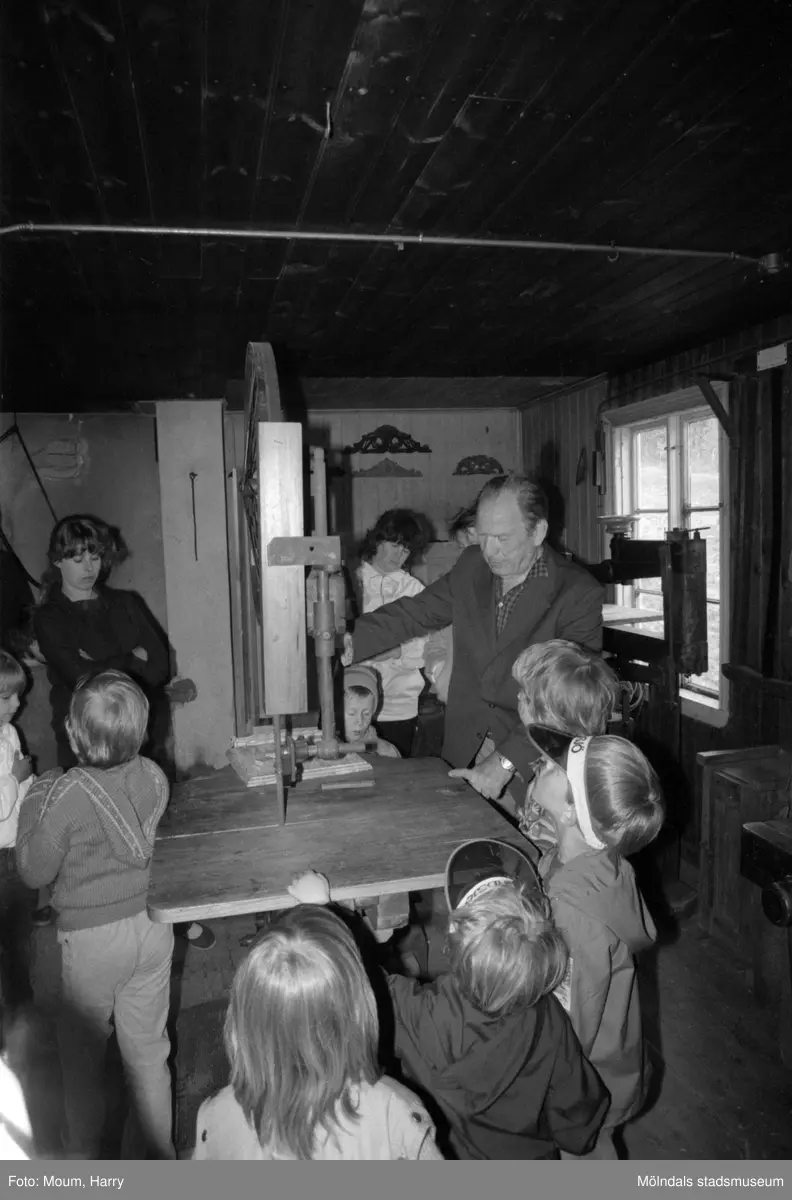 Kultur för barn på Börjesgården i Hällesåker, Lindome, år 1984. "Gunnar Hellgren i Lindome Hembygdsgille visade olika prylar på Börjesgården."