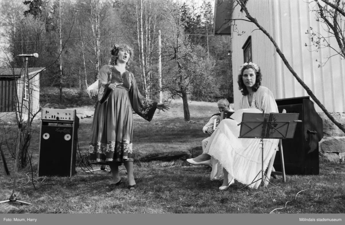 Titel: Almåsgården och Lindome hembygdsgille anordnar sommarkafé på Börjesgården i Hällesåker, år 1984. Musikunderhållning av Greta Wirsén med dottern Anna. För mer information om bilden se under tilläggsinformation.