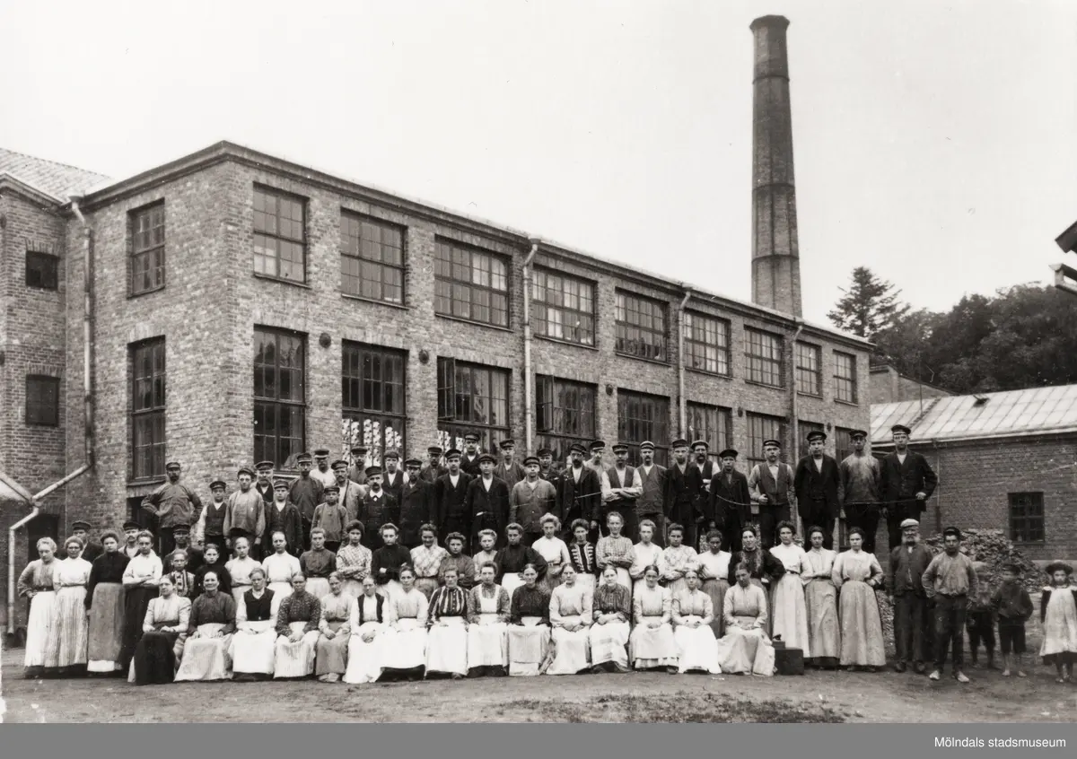 Anderstorps fabriker i Lindome. Personal framför fabriken Nya spinneriet (byggdes 1907). Fotot taget innan ombyggnaden.
