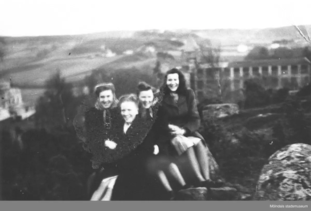Saida och hennes tre estländska väninnor, 1944. I bakgrunden syns August Werners fabrik där de unga kvinnorna fick arbete. Hösten 1944 flydde 32.000 estländare från kriget i Estland till Sverige. Ett sextiotal personer tog jobb på August Werners textilfabrik i Lindome.
