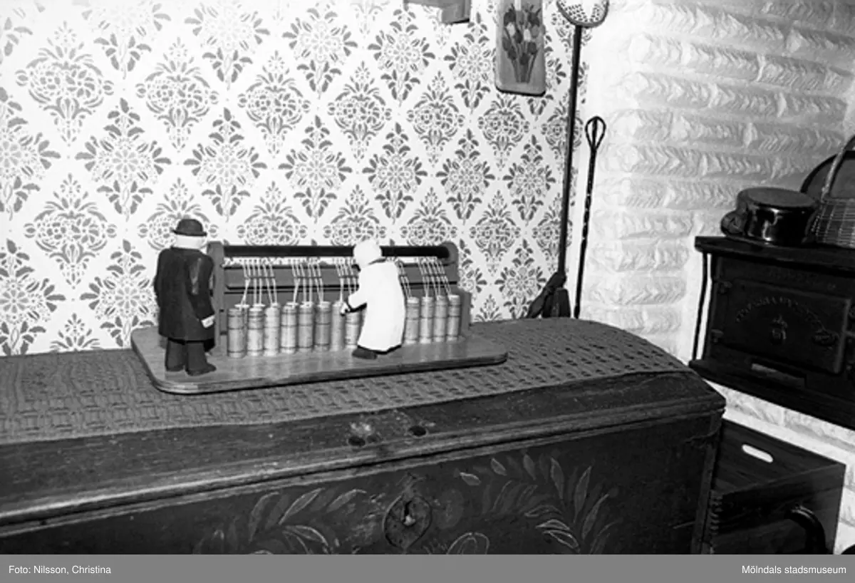 En liten spinnerimodell ståendes på en brudkista, hösten 1994. Modellen föreställer en kvinna som arbetar med spinnerirullar, i änden står en man och ser på. Från Werners fabrik, Annestorp, Lindome. Relaterade motiv: 2001_0692 och 2006_0341.