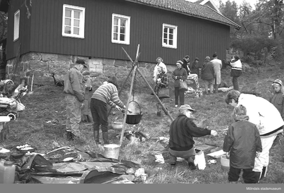 Familjesöndag vid Börjesgården, 1994-05-15. Besökare ser på när Museichef Mari-Louise Olsson kokar soppa över öppen eld. Sittandes på huk är museitekniker Alf Garthman.