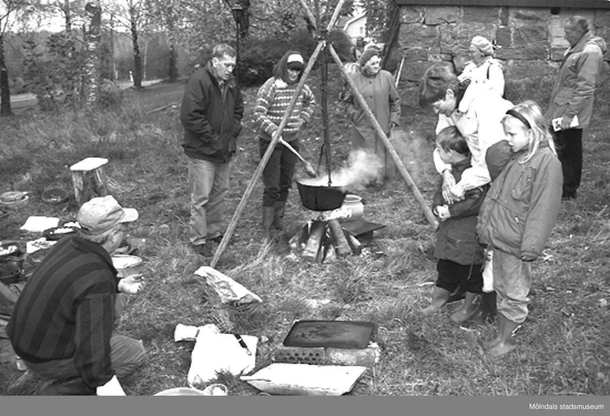 Familjesöndag vid Börjesgården, 1994-05-15. Besökare ser på när Museichef Mari-Louise Olsson kokar soppa över öppen eld. Längst ner till vänster ses museitekniker Alf Garthman.