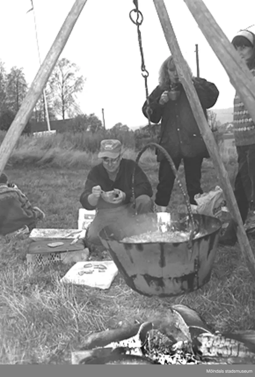 Familjesöndag vid Börjesgården, 1994-05-15. Närbild av en gryta som hänger över öppen eld. Sittande till vänster är museitekniker Alf Garthman och till höger står museichef Mari-Louise Olsson. De smakar på den färdiga grytan.