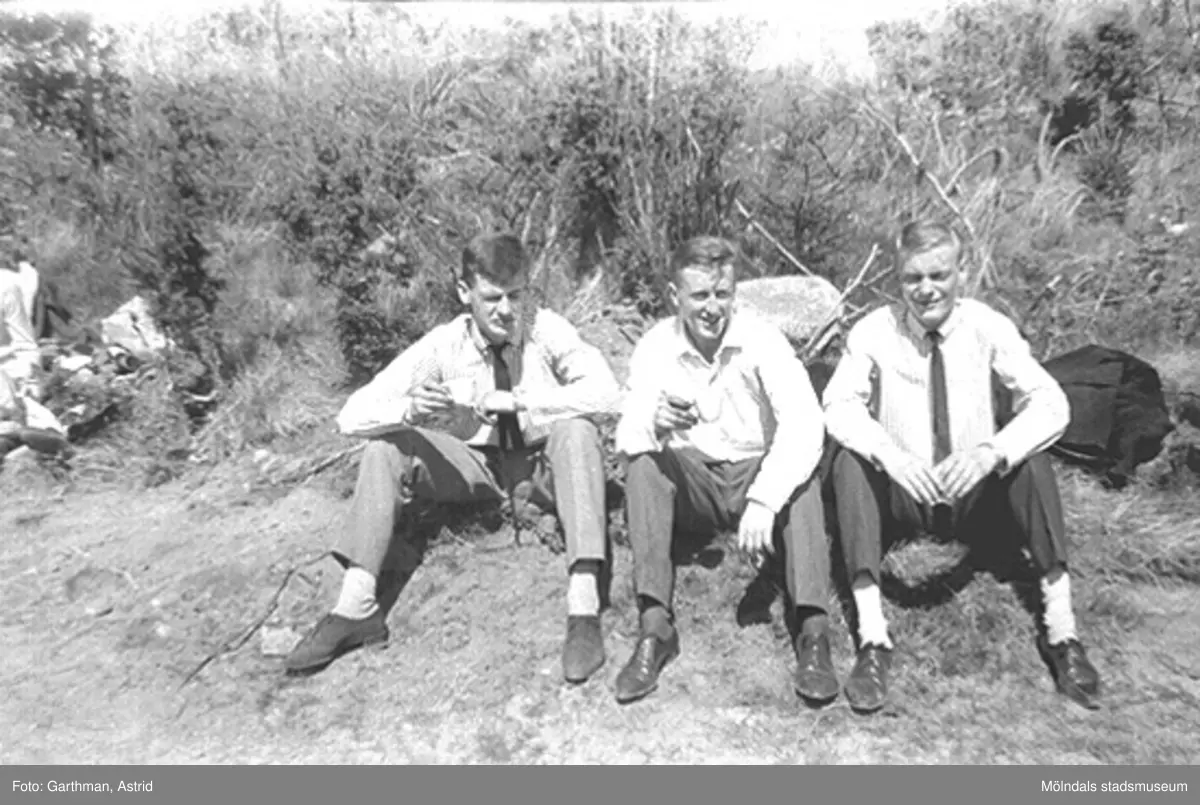 Söndagsutflykt till motokrossbanan i Blixås. Kamraterna Kjell Lager, Leif Garthman och Roger Karlsson sitter och fikar i solen. De unga männen är uppklädda, som man var på fritiden under 60-talet, i byxor, randig alt. vit skjorta, slips och lågskor. Blixåsbanan, 1965.