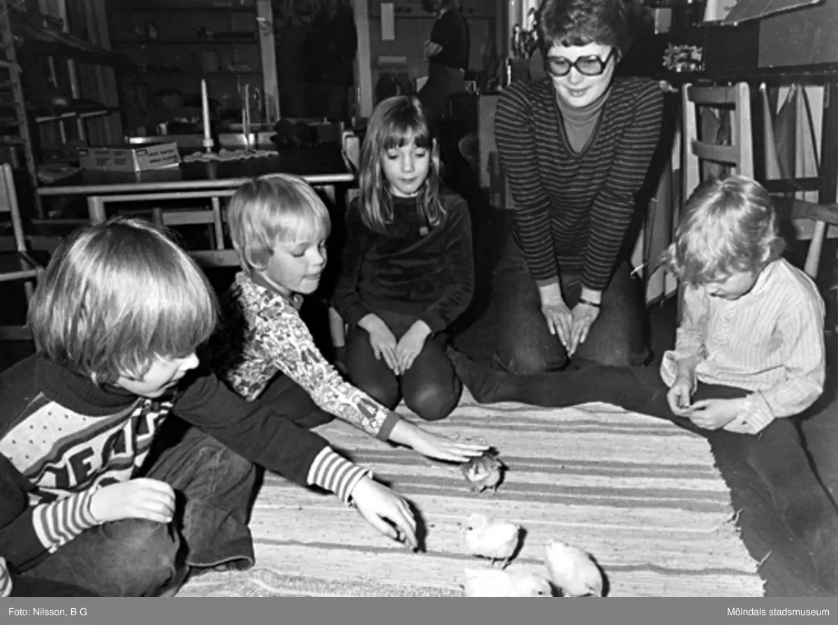 Några barn och en fröken klappar fyra kycklingar som går på en matta. Holtermanska daghemmet 1973.