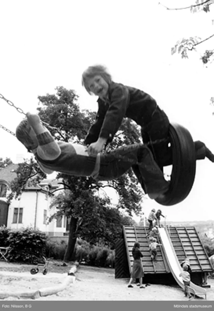 Två pojkar som gungar tillsammans. Holtermanska daghemmet 1973.