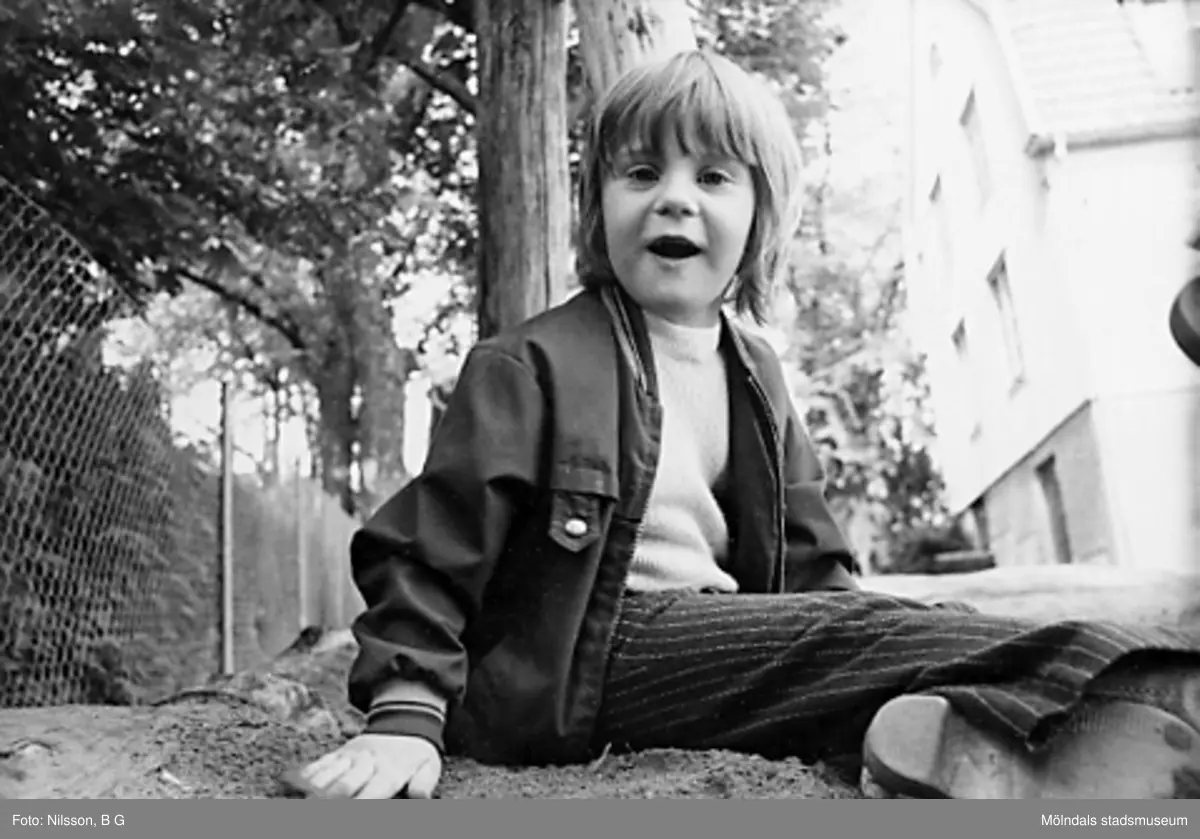 Ett barn sitter i sandlådan. Holtermanska daghemmet juni 1974.