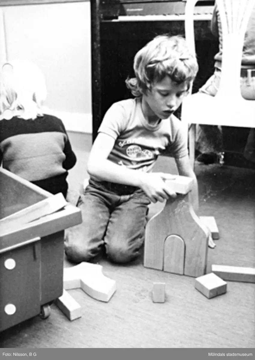 Ett barn som leker med klossar. Holtermanska daghemmet maj 1975.