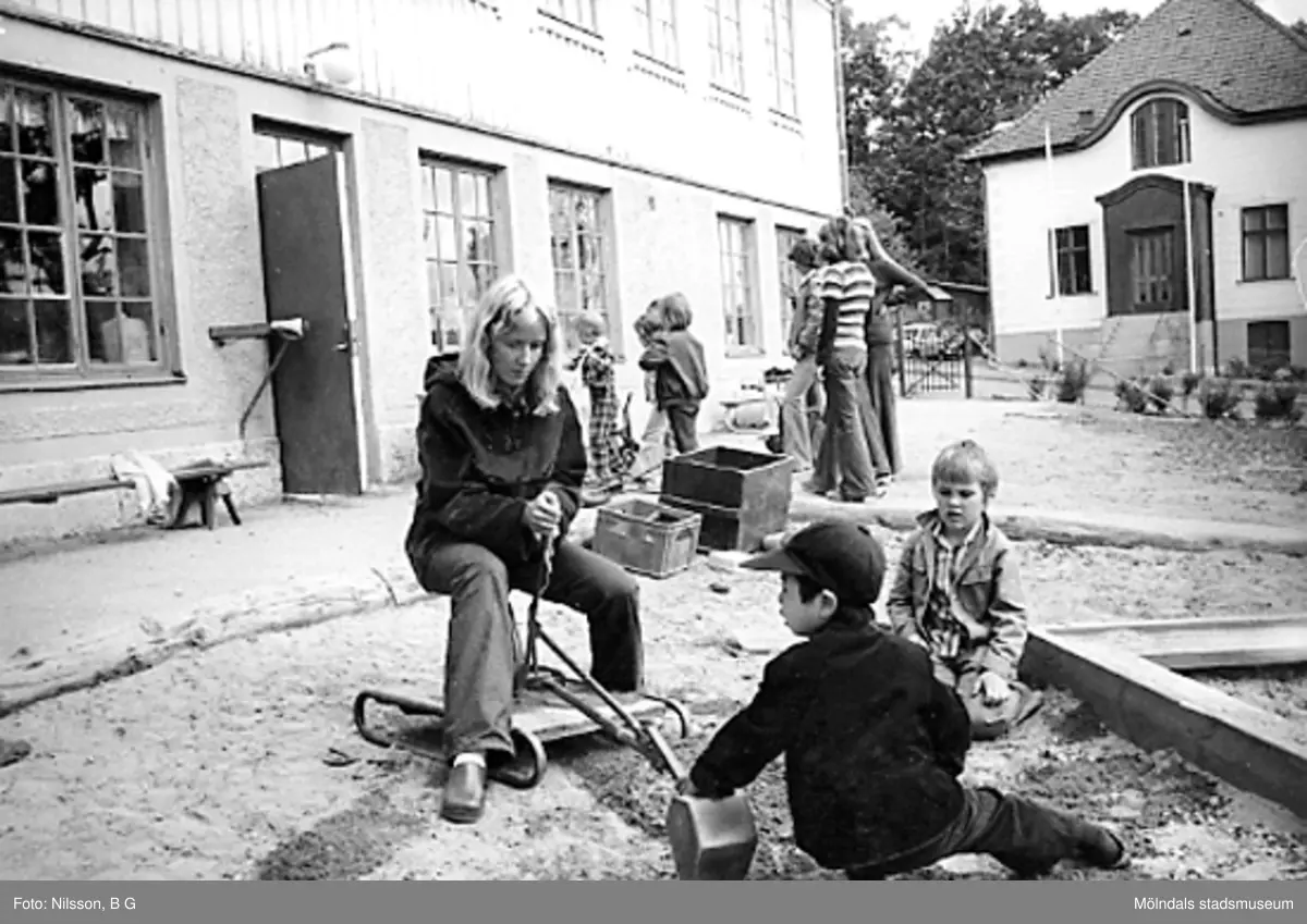 Barn och vuxna som leker i sandlådan. Holtermanska daghemmet juni 1974.