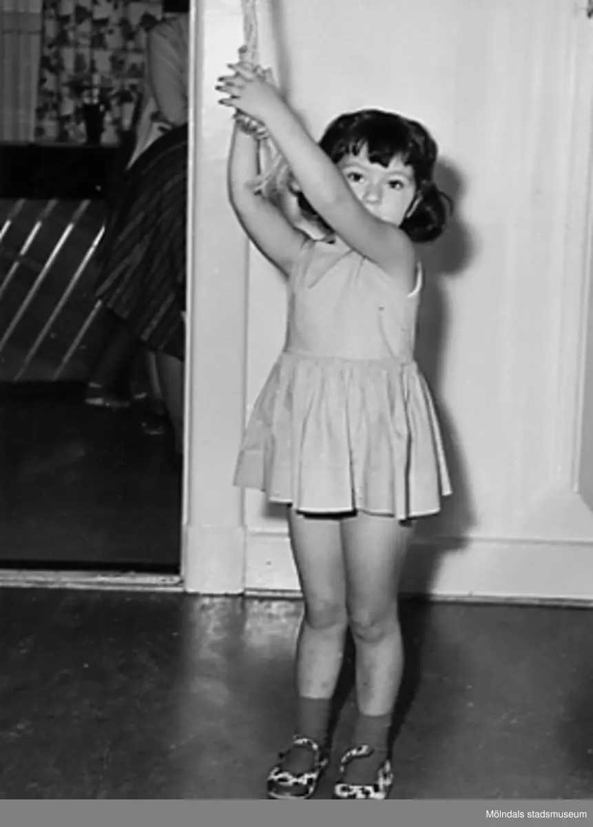 En flicka leker med ett rep som hänger från taket vid Holtermanska daghemmet 1953.