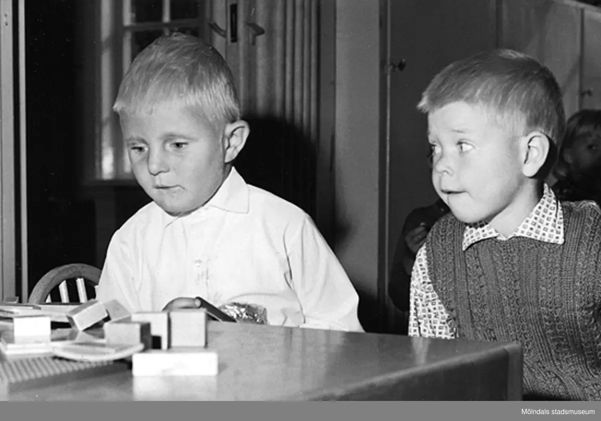 Två pojkar som leker vid ett bord. Holtermanska daghemmet 1953.