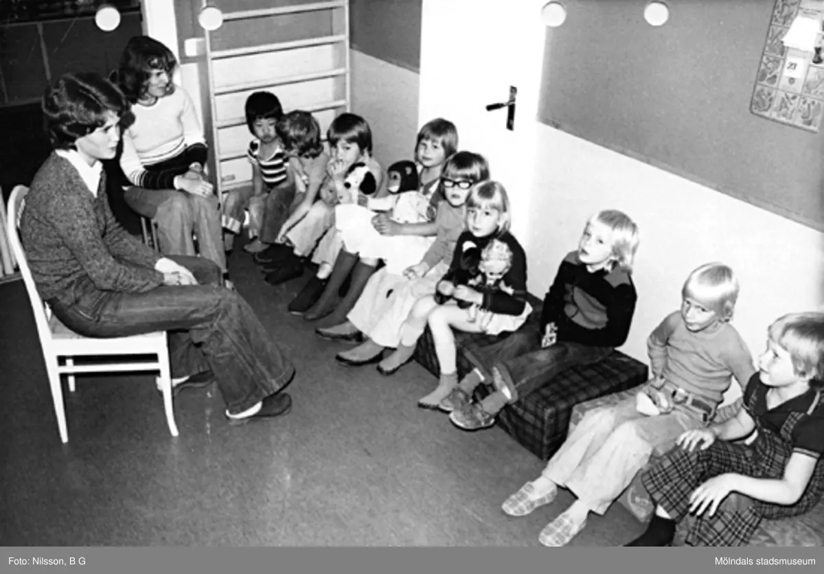 Barn som sitter på en bänk vid väggen och två fröknar som sitter på var sin stol mittemot barnen. Holtermanska daghemmet maj 1975.
