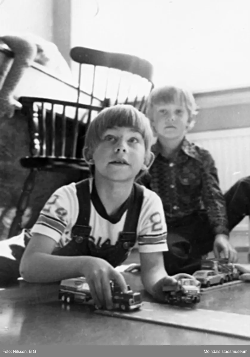 Två pojkar som leker med bilar. Holtermanska daghemmet, okänt årtal.