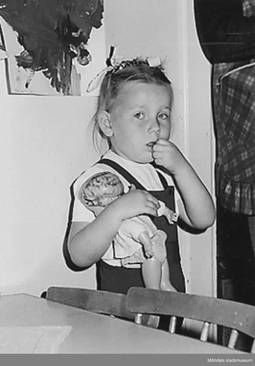 En flicka med en docka i famnen. Holtermanska daghemmet 1953.