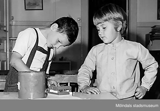 Två pojkar som leker med lego vid Holtermanska daghemmet 1953.
