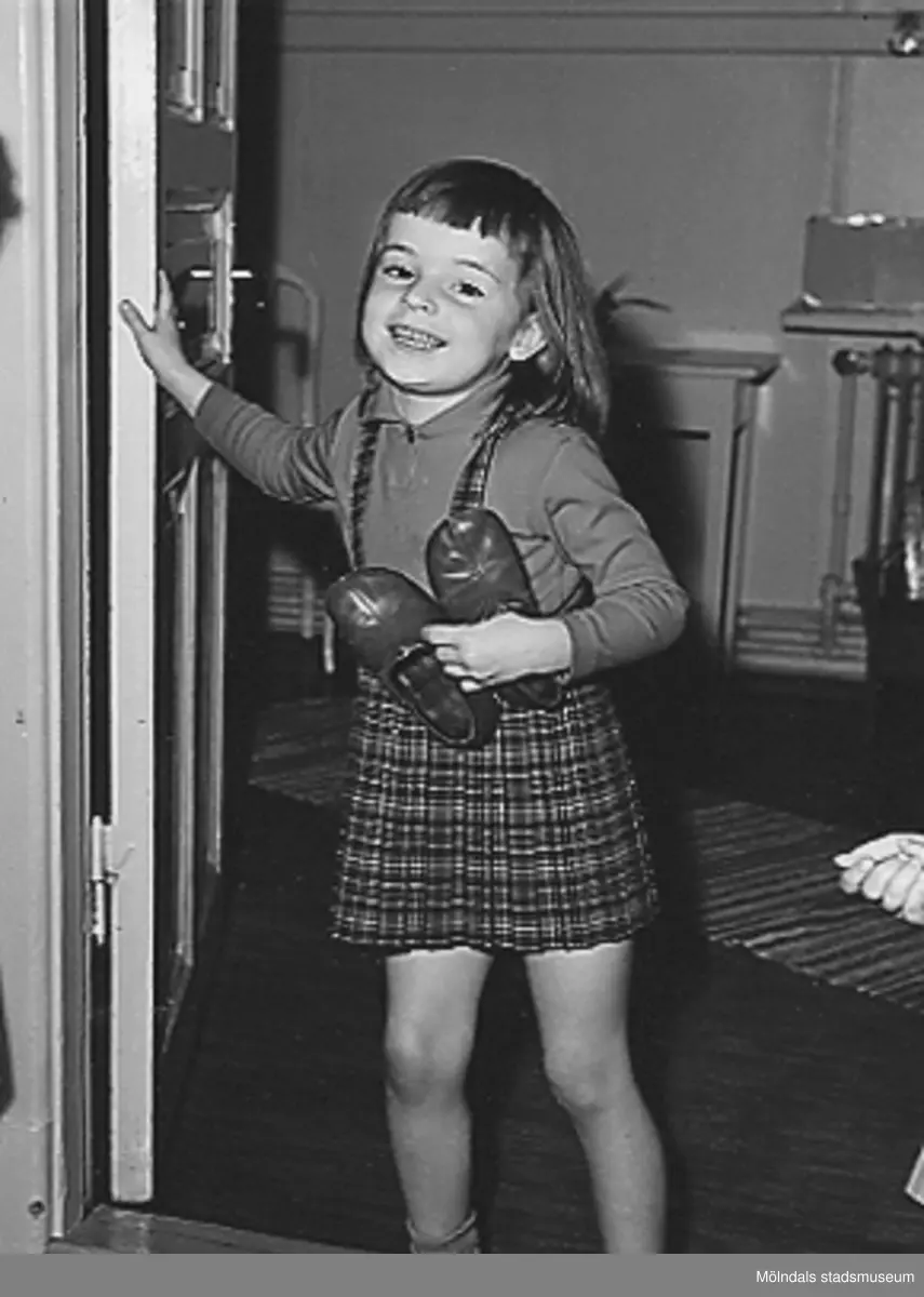 En flicka, med ett par tofflor i ena handen, står utanför en dörröppning vid Holtermanska daghemmet 1953.