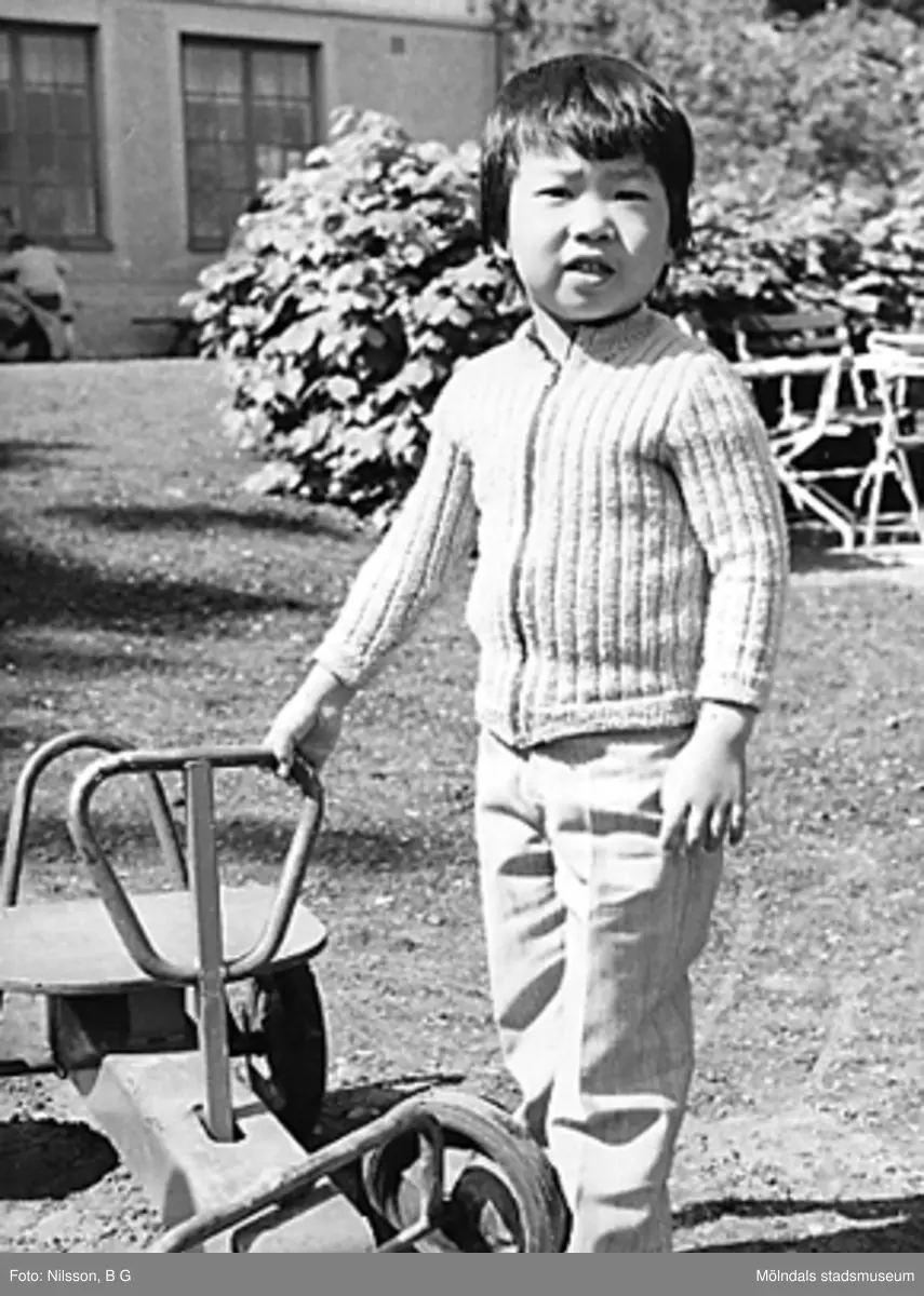 Ett barn som står utomhus med en trampbil. Holtermanska daghemmet juni 1973.