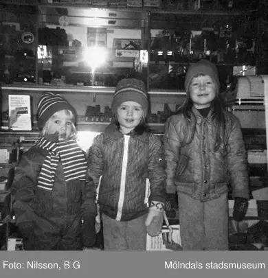 Tre höst-/vinterklädda barn som står i en affär. De kommer från Holtermanska daghemmet, 1973.