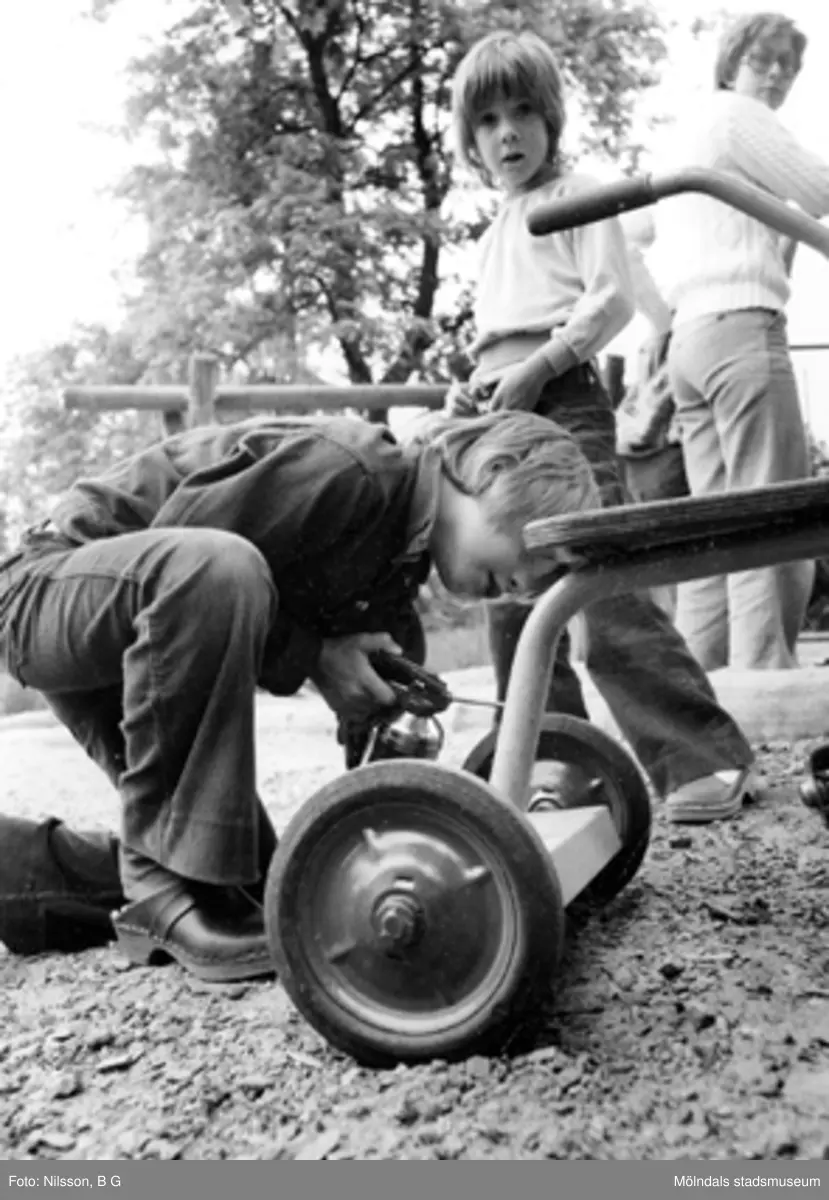 En pojke smörjer hjulet på en trehjuling. Holtermanska daghemmet 1973.