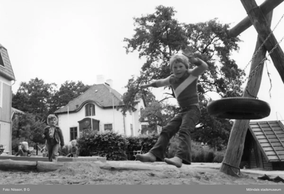 En pojke som hoppar av en gunga i farten. Holtermanska daghemmet 1973.
