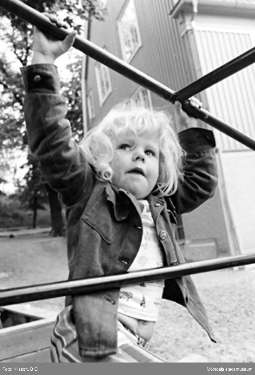 Ett barn i en klätterställning. Holtermanska daghemmet 1973.
