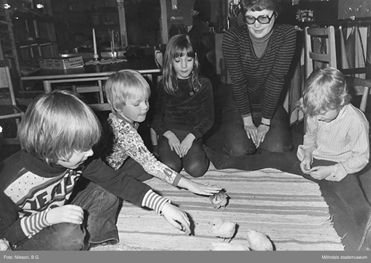 Fyra dagbarn och en fröken som klappar kycklingar som är på en matta. Holtermanska daghemmet juni 1974.
