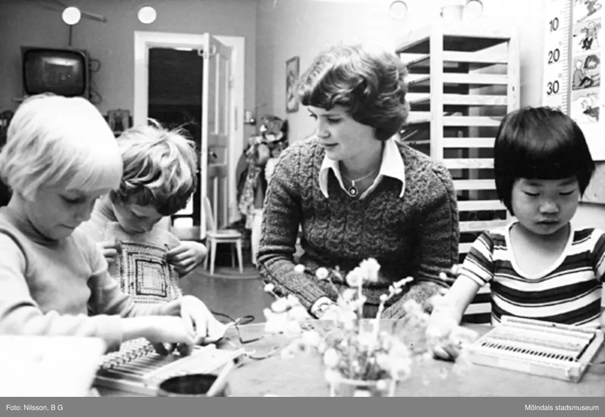 Tre barn som väver tillsammans med en lärarinna. Holtermanska daghemmet maj 1975.