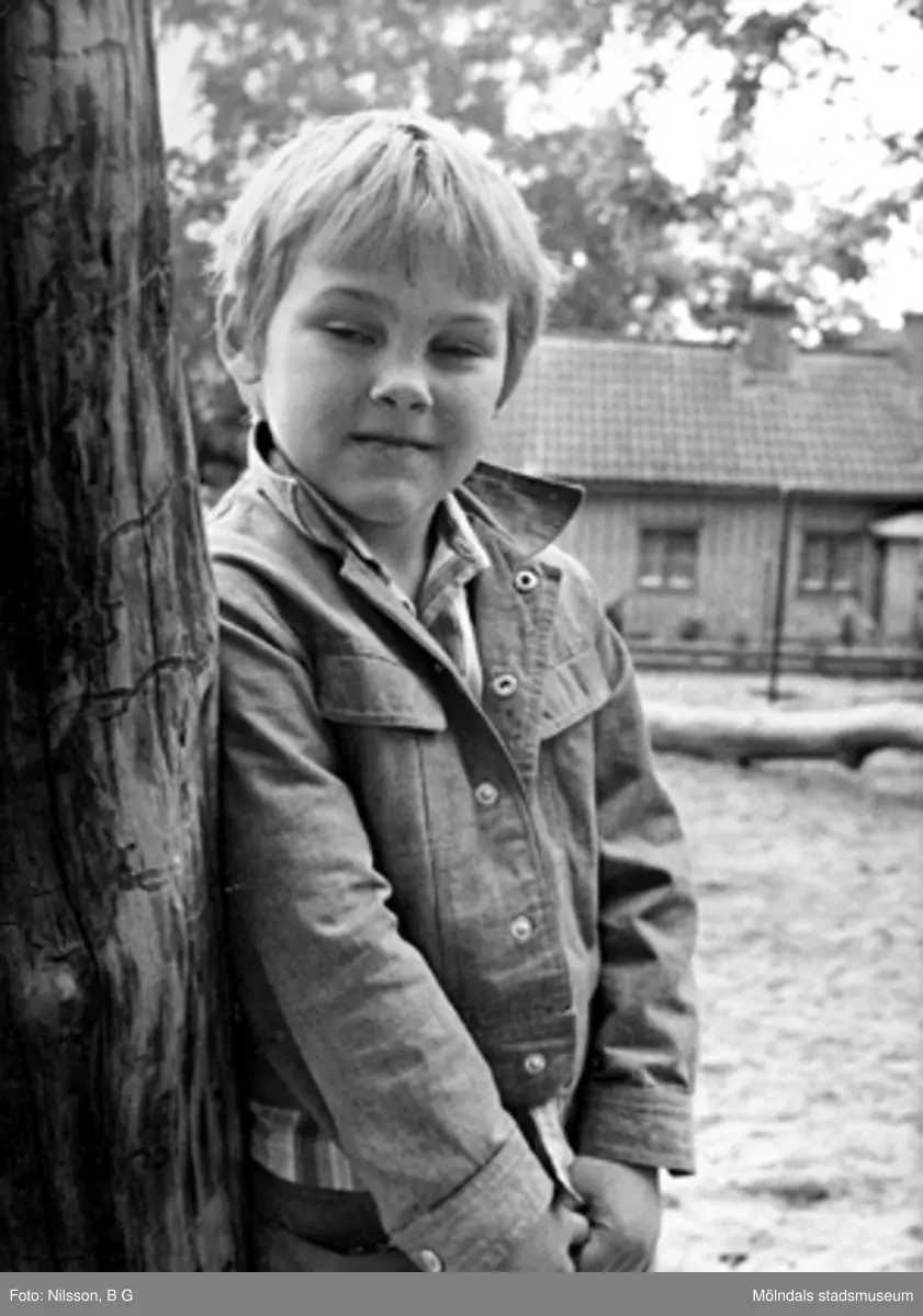 En pojke som lutar sig mot en trädstam. Holtermanska daghemmet juni 1974.