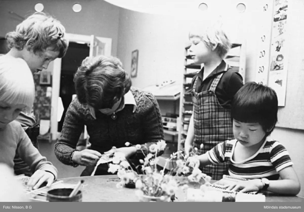 Fyra barn och en fröken som pysslar. Holtermanska daghemmet maj 1975.