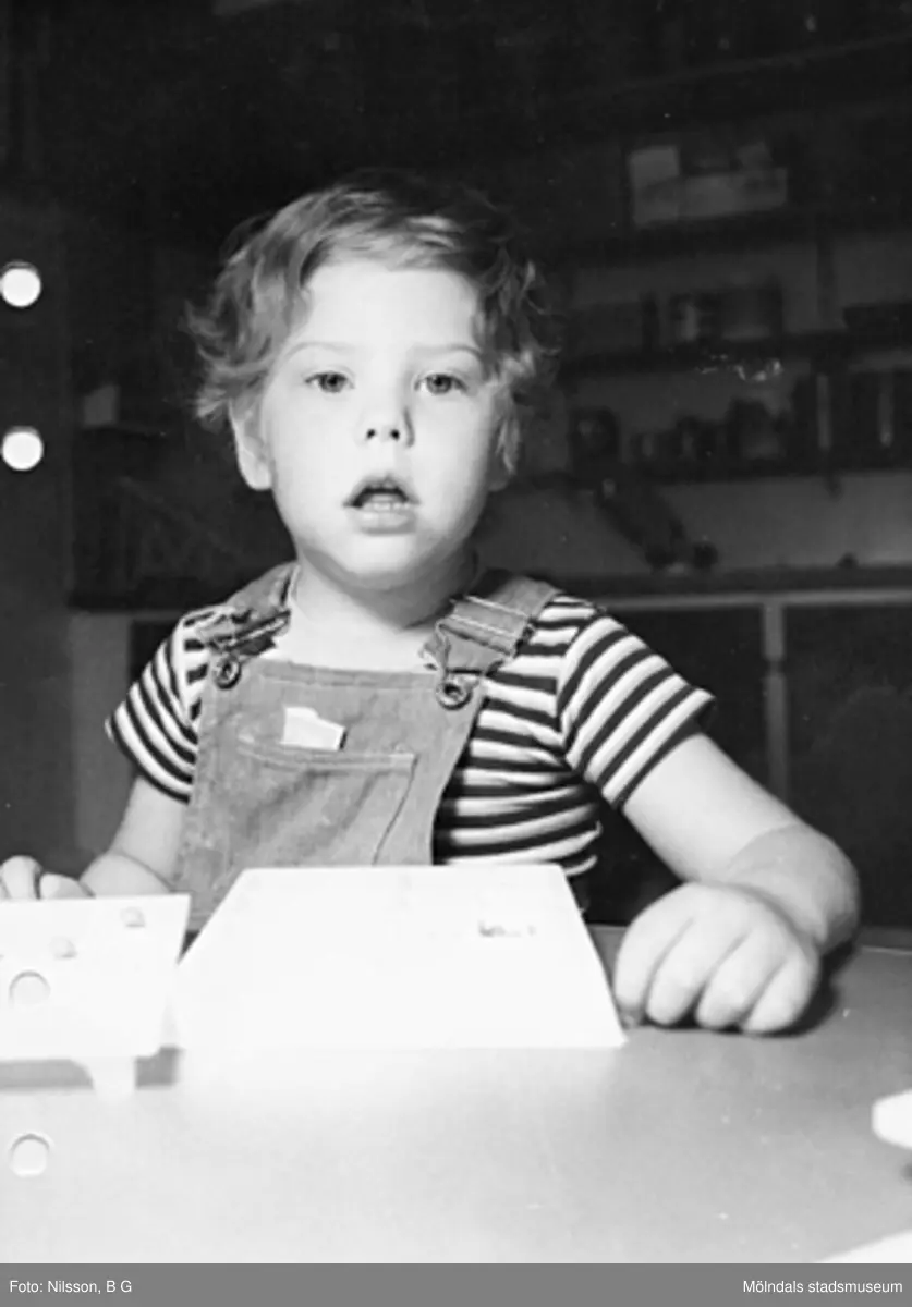 Ett barn som pysslar med papper. Holtermanska daghemmet maj 1975.