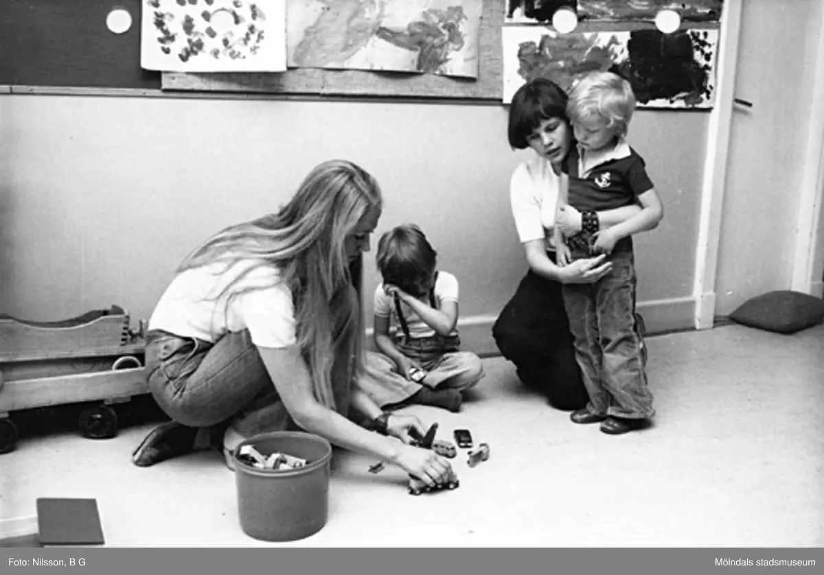 Två barn och två fröknar leker med bilar på golvet. Holtermanska daghemmet maj 1975.