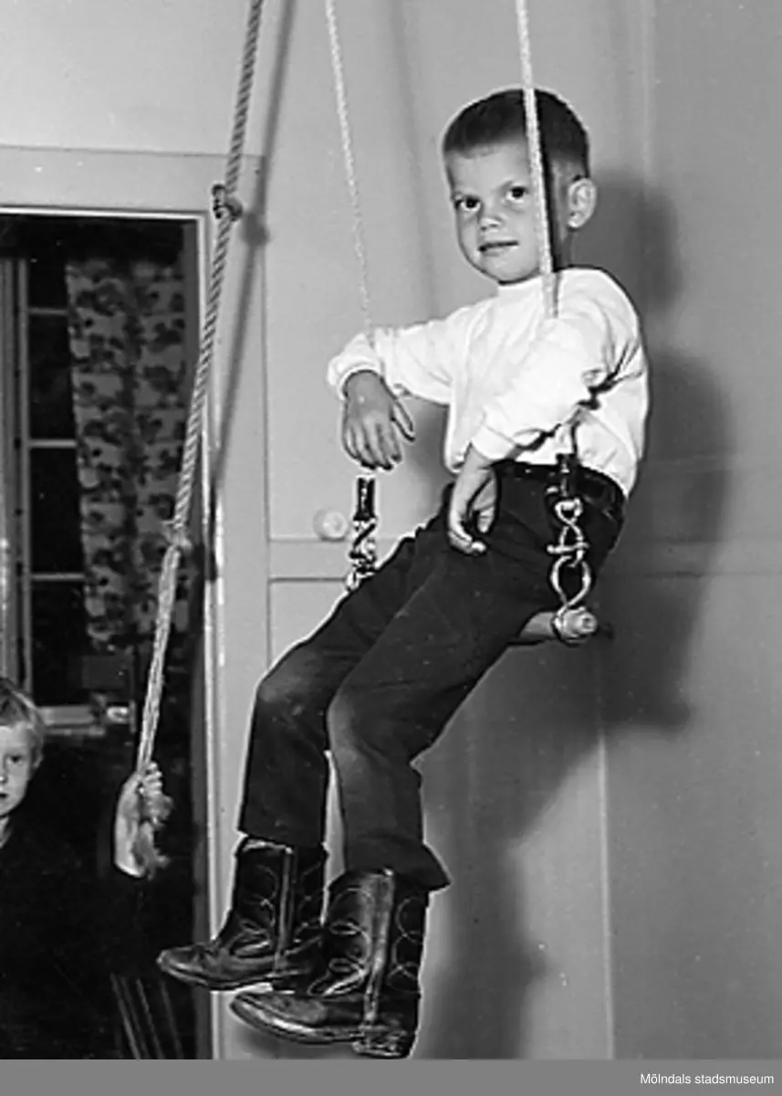 En pojke sitter i en trapets hängande från taket vid Holtermanska daghemmet 1953.