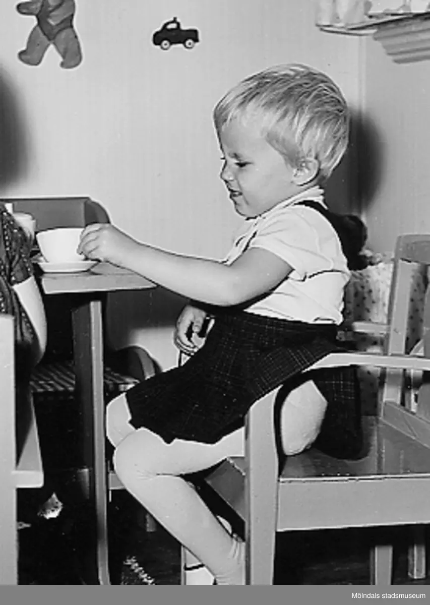 En flicka sitter vid ett bord och har ett set med kopp och fat framför sig. Holtermanska daghemmet 1953.