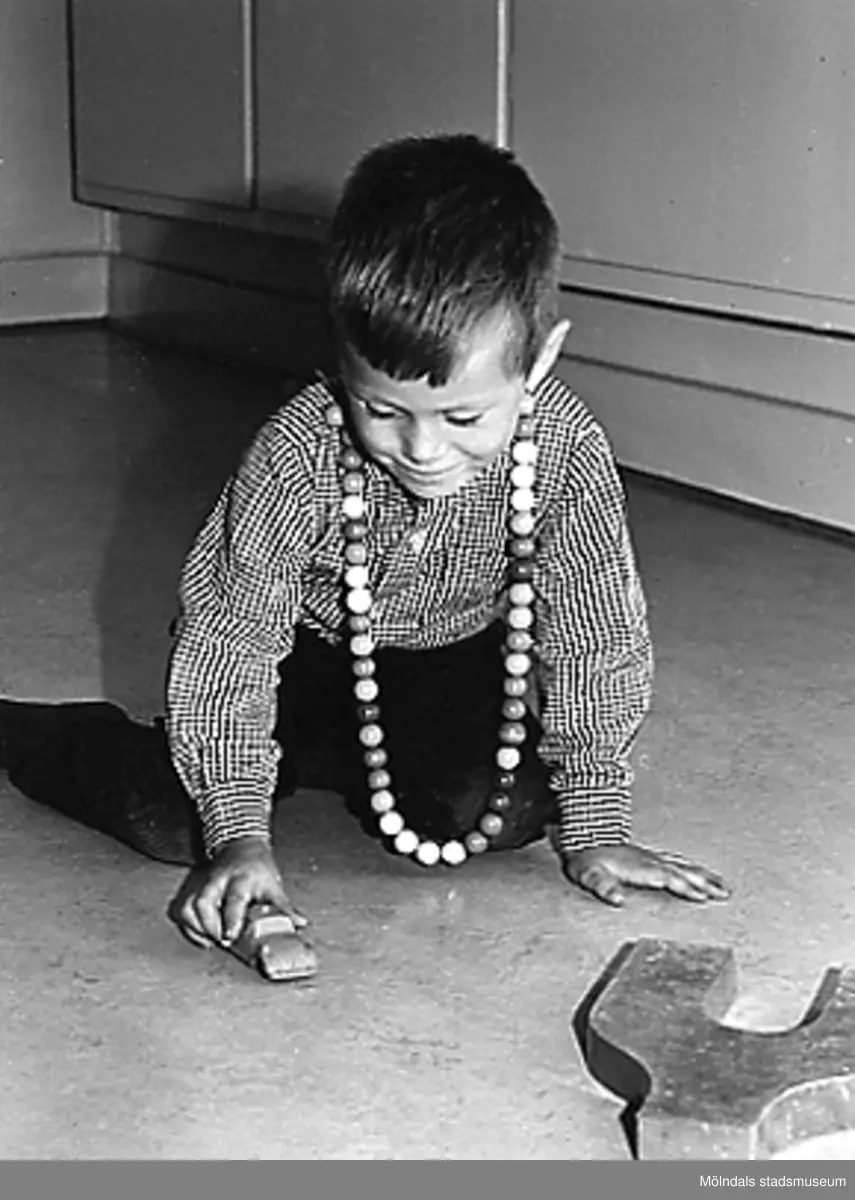 En pojke som leker med bilar på golvet vid Holtermanska daghemmet 1953.