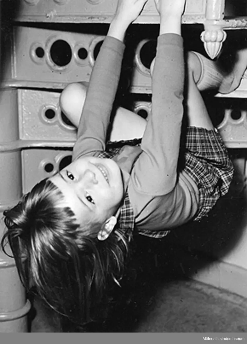 En glad flicka armhänger i trappan vid Holtermanska daghemmet 1953.
