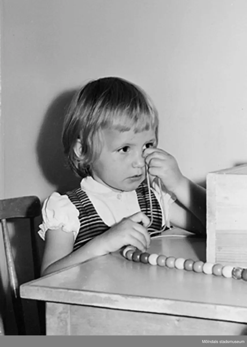 Flickan Marita Andersson, gift Björk, som trär kulor på en tråd. Holtermanska daghemmet 1953.