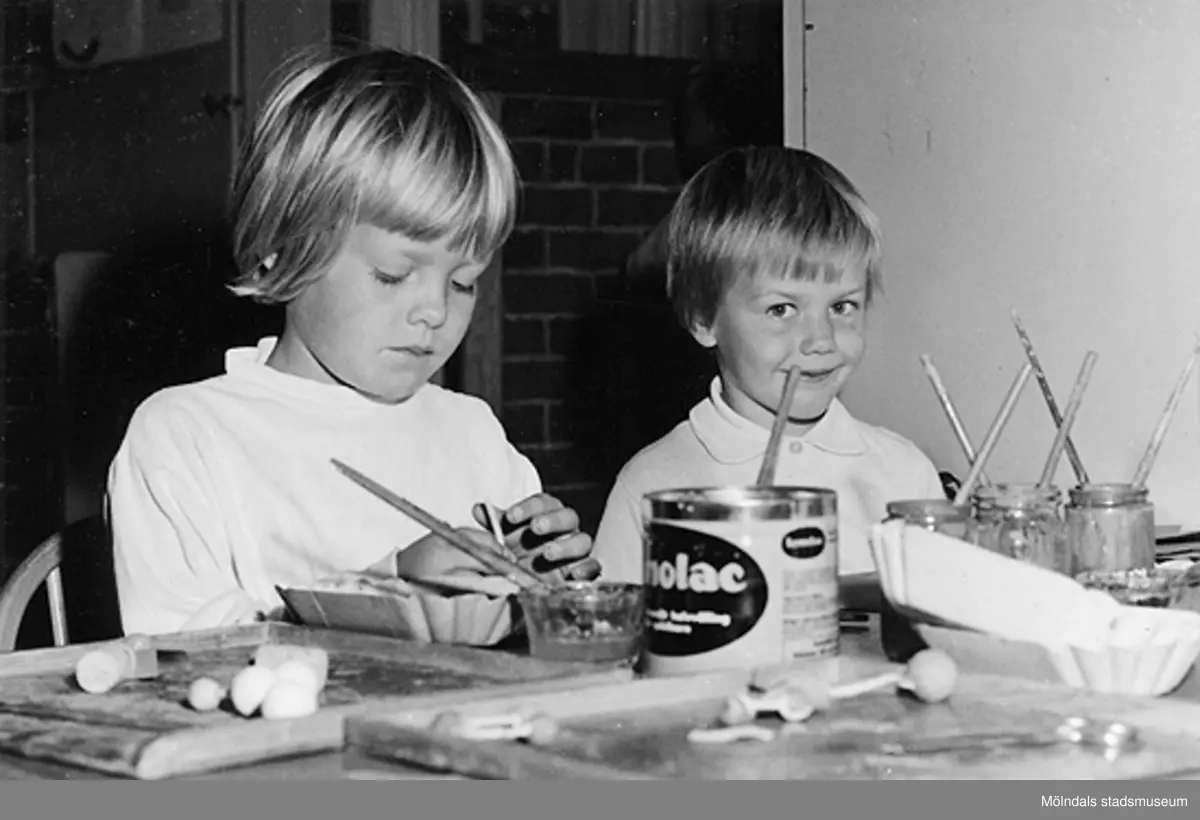 Två barn målar och pysslar vid ett bord. Holtermanska daghemmet 1953.