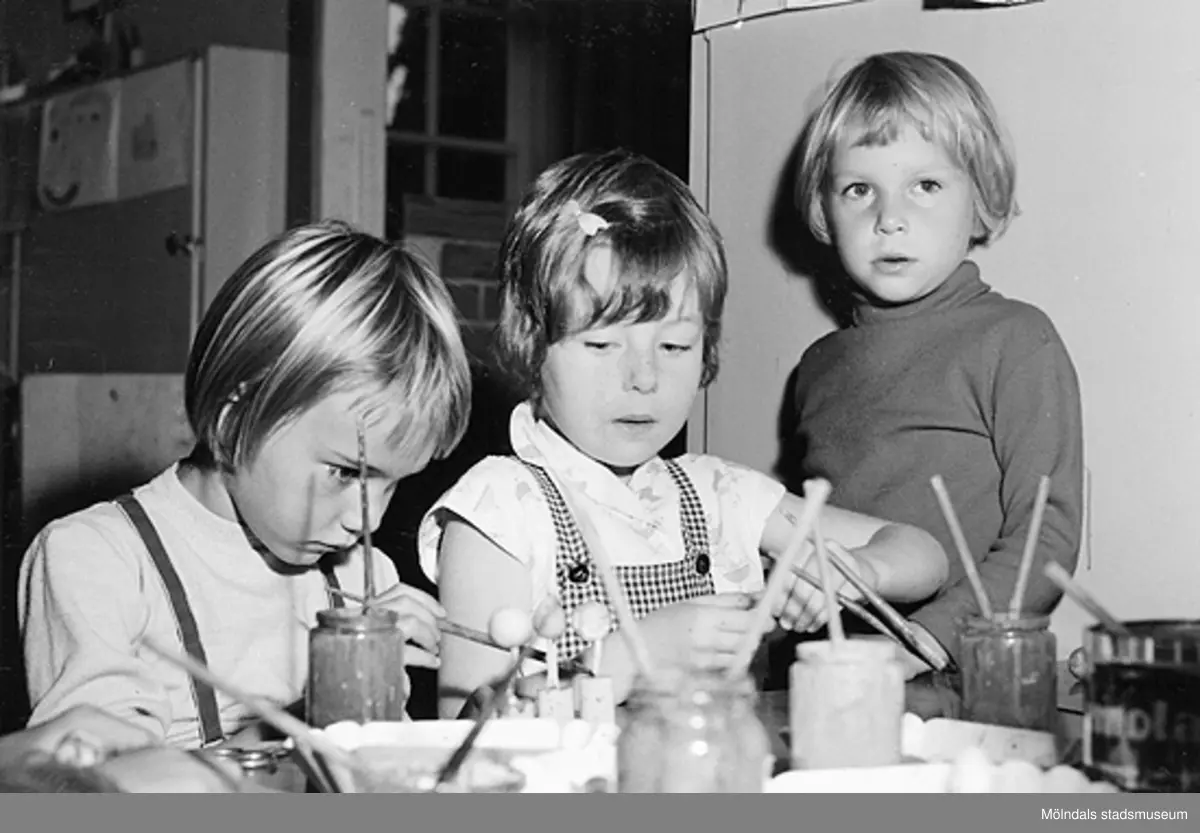 Tre barn som pysslar och målar. Holtermanska daghemmet 1953.