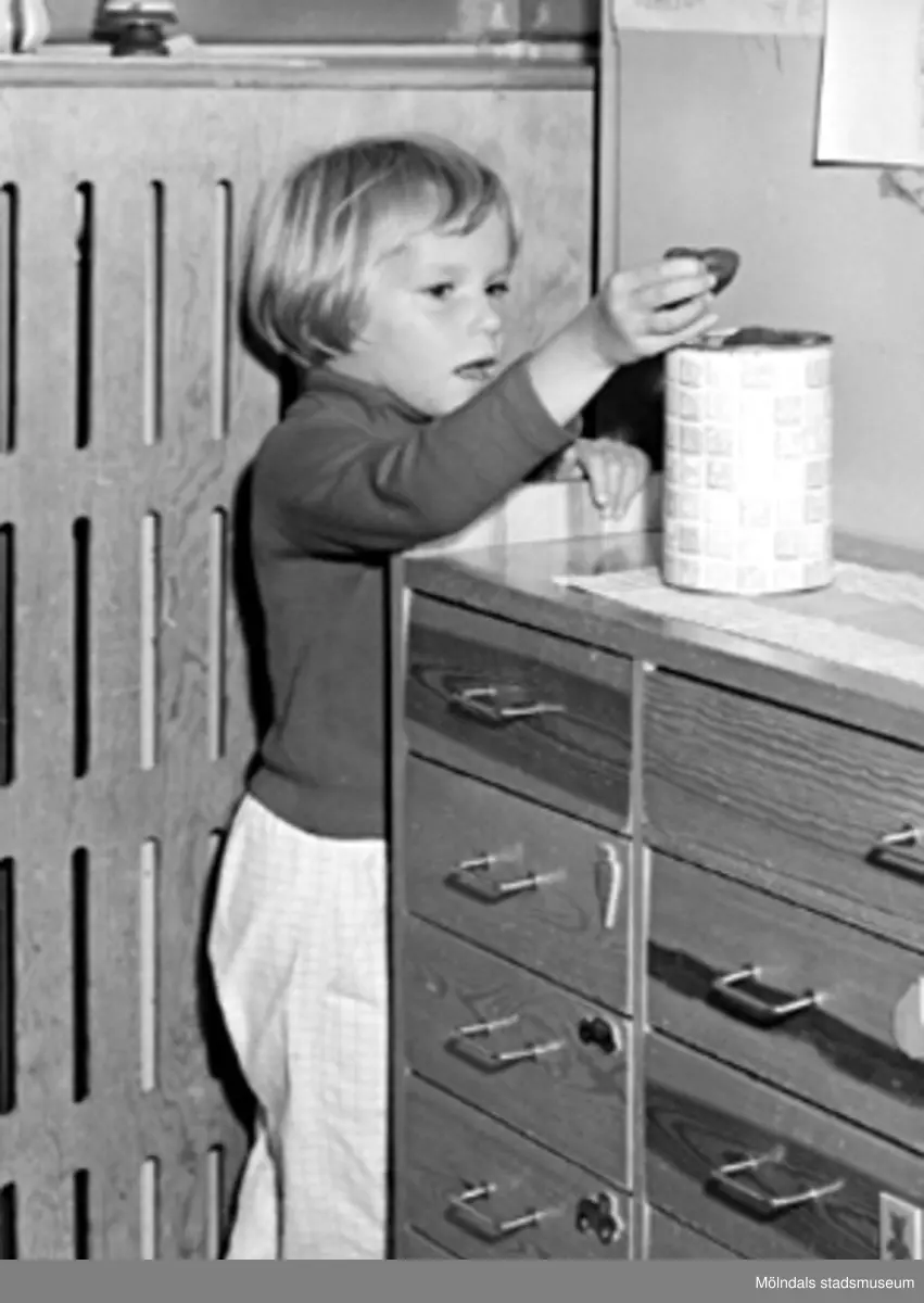 En flicka står vid en skänk och lägger i/tar ur något i en burk. Holtermanska daghemmet 1953.