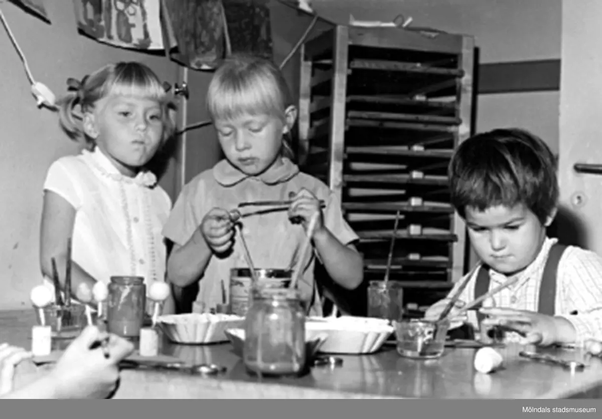 Tre barn som pysslar vid ett bord. Holtermanska daghemmet 1953.