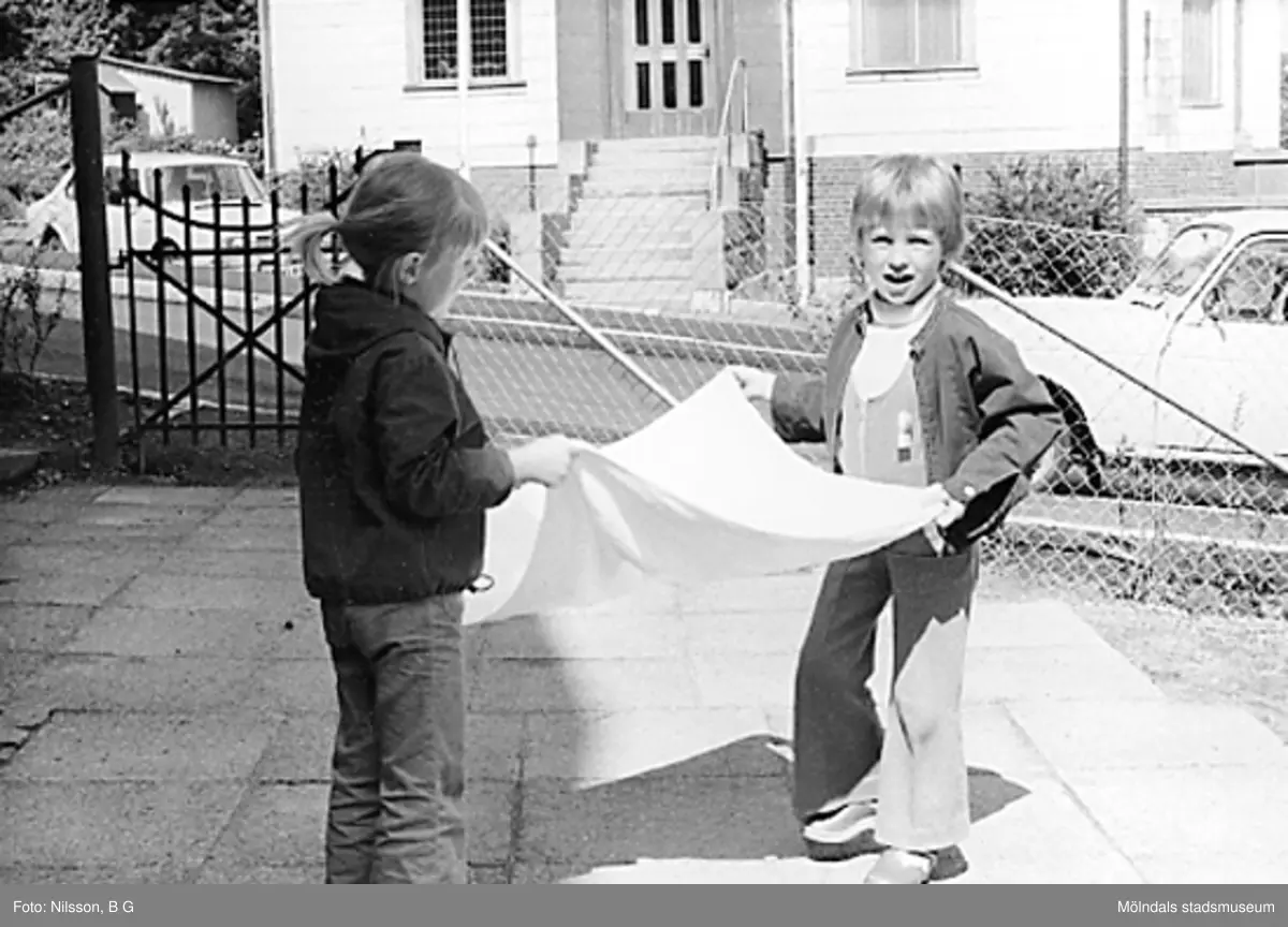 Två barn som skakar ett ljust tygstycke utanför Holtermanska daghemmet juni 1973.
