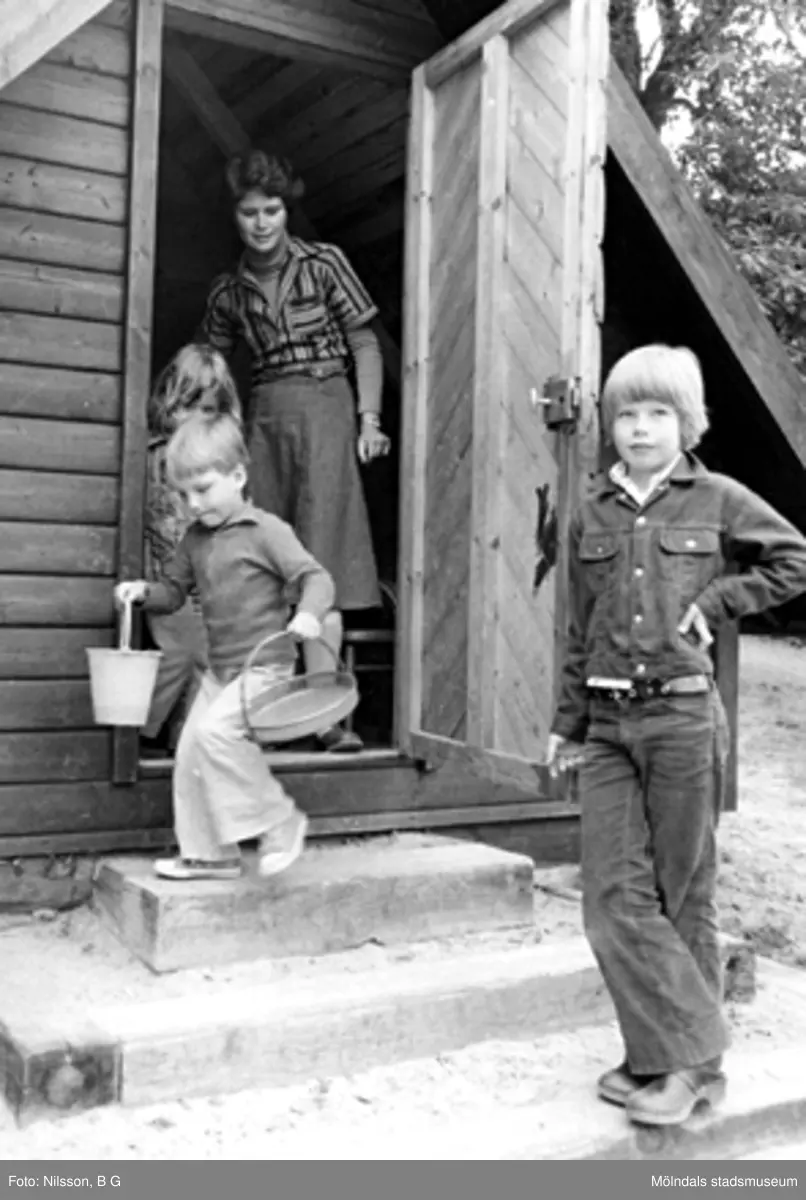 Tre barn och en fröken vid ett förrådshus. Holtermanska daghemmet 1973.
