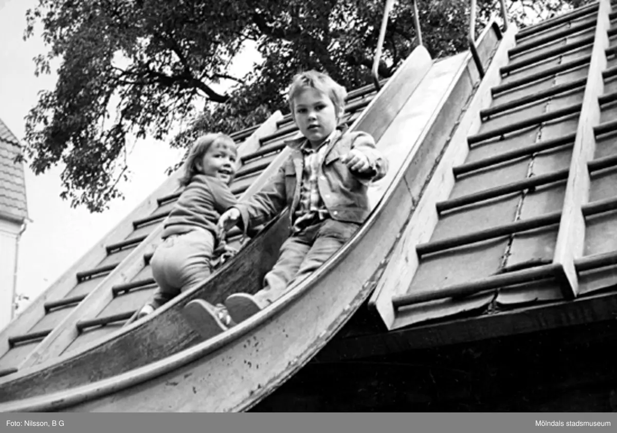 Två barn i en rutschbana. Holtermanska daghemmet juni 1974.