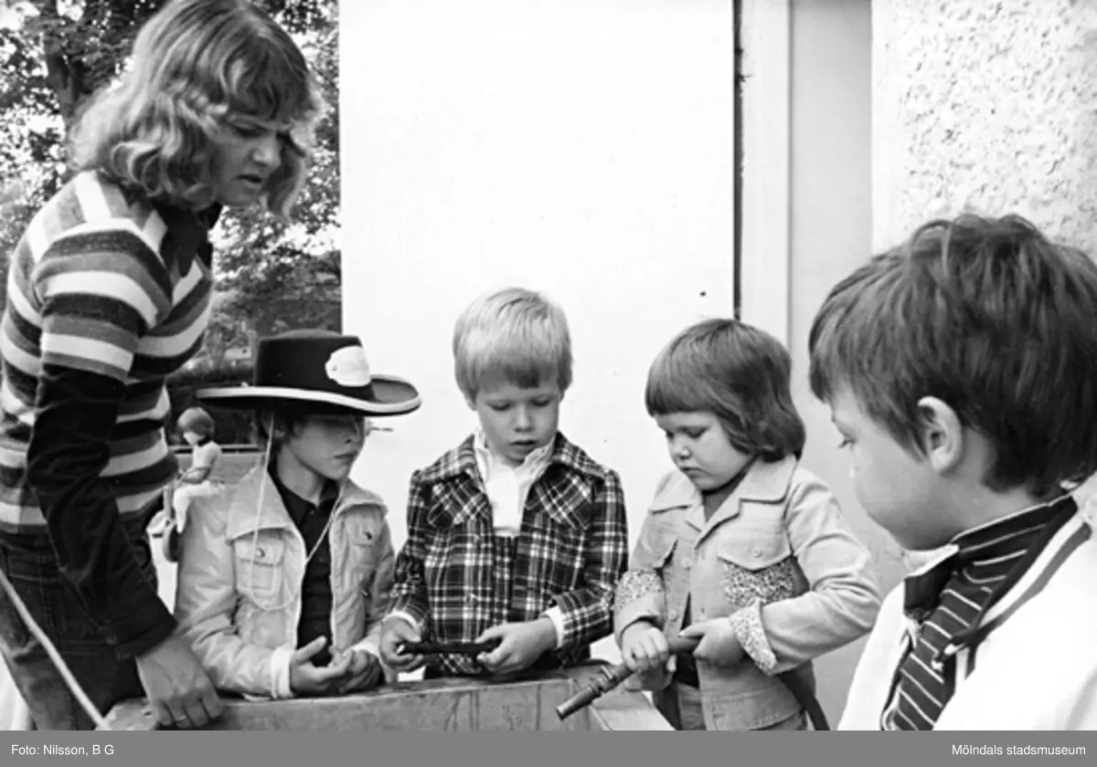 En fröken och fyra pojkar står samlade runt en behållare. Holtermanska daghemmet juni 1974.